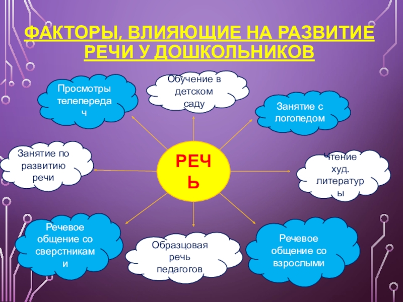Слайд 4Факторы, влияющие на развитие речи у дошкольников