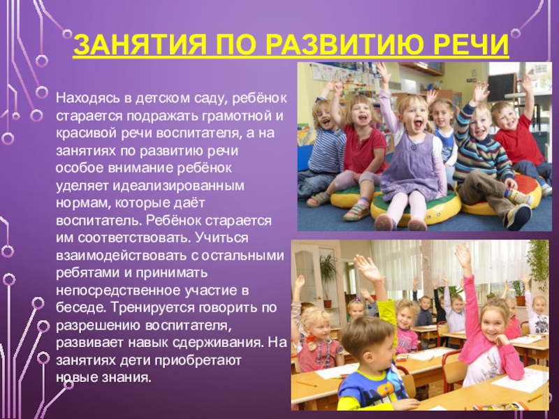 и красивой речи воспитателя, а на занятиях по развитию речи особое внимание ребёнок уделяет идеализированным нормам, которые даёт воспитатель. Ребёнок старается им соответствовать. Учиться взаимодействовать с остальными ребятами и принимать непосредственное участие в беседе. Тренируется говорить по разрешению воспитателя, развивает навык сдерживания. На занятиях дети приобретают новые знания.
