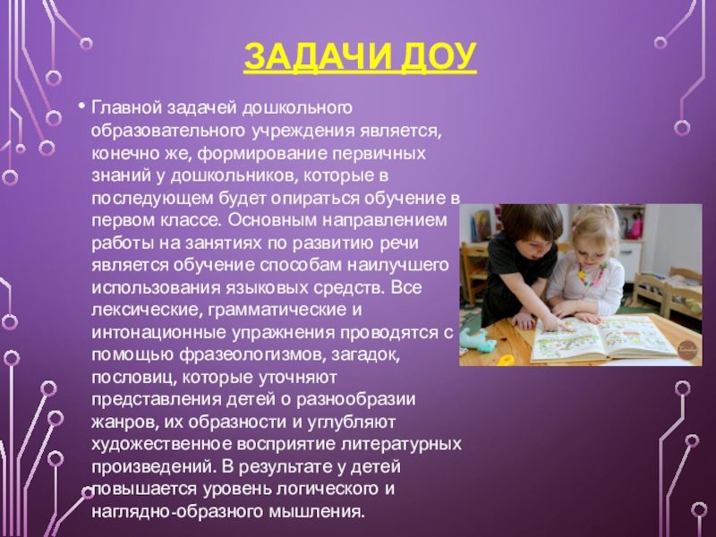 знаний у дошкольников, которые в последующем будет опираться обучение в первом классе. Основным направлением работы на занятиях по развитию речи является обучение способам наилучшего использования языковых средств. Все лексические, грамматические и интонационные упражнения проводятся с помощью фразеологизмов, загадок, пословиц, которые уточняют представления детей о разнообразии жанров, их образности и углубляют художественное восприятие литературных произведений. В результате у детей повышается уровень логического и наглядно-образного мышления.