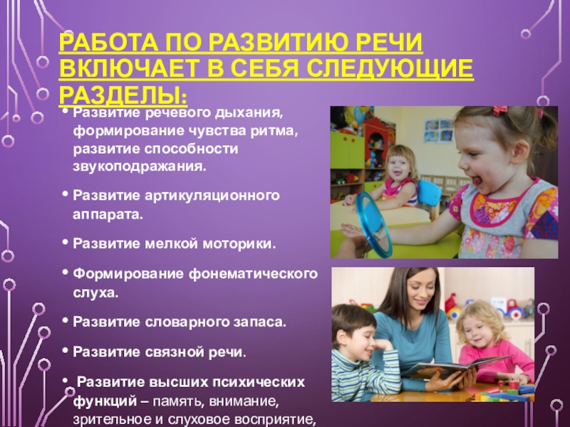 Слайд 13Работа по развитию речи включает в себя следующие разделы: