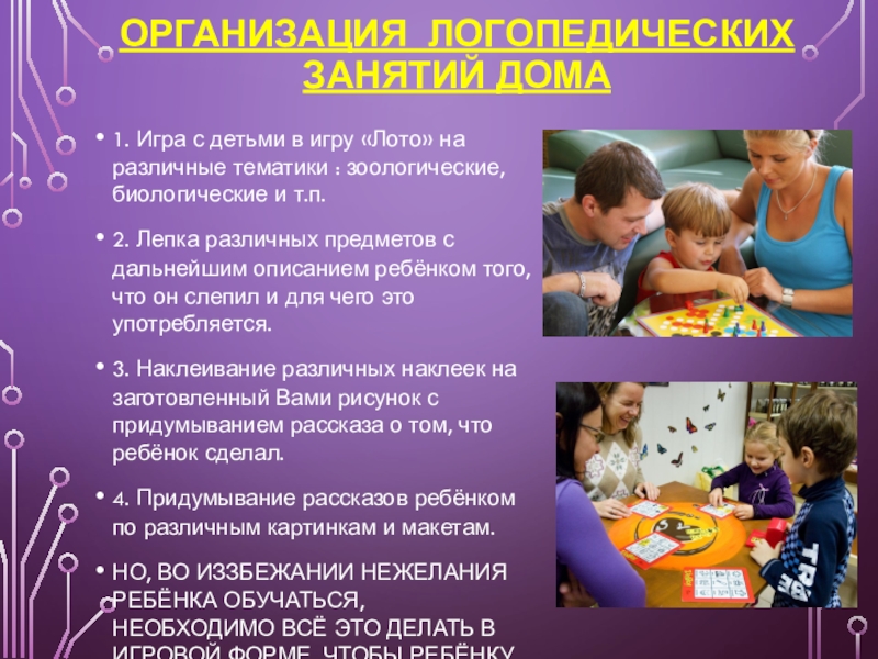 Проводить с ребёнком игры на развитие слухового внимания или фонематического слуха, игры на формирование лексико-грамматических категорий, игры на развитие мелкой моторики.