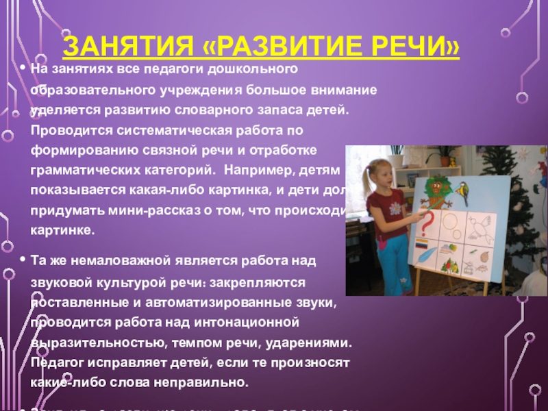 уделяется развитию словарного запаса детей. Проводится систематическая работа по формированию связной речи и отработке грамматических категорий. Например, детям показывается какая-либо картинка, и дети должны придумать мини-рассказ о том, что происходит на картинке.