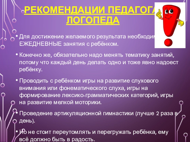 Для достижение желаемого результата необходимы ЕЖЕДНЕВНЫЕ занятия с ребёнком.