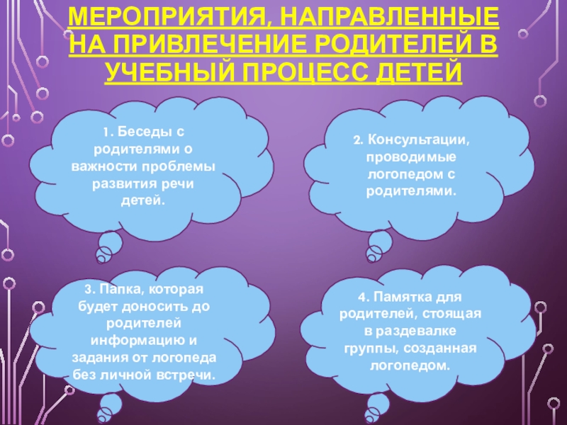 Слайд 16Мероприятия, направленные на привлечение родителей в учебный процесс детей
