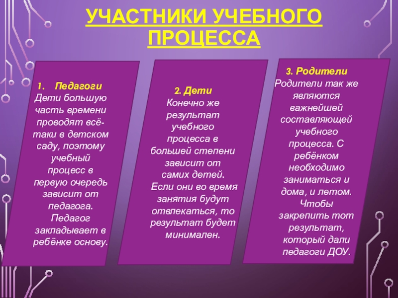 Родители так же являются важнейшей составляющей учебного процесса. С ребёнком необходимо заниматься и дома, и летом. Чтобы закрепить тот результат, который дали педагоги ДОУ.