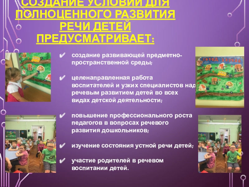 Слайд 9Создание условий для полноценного развития речи детей предусматривает: