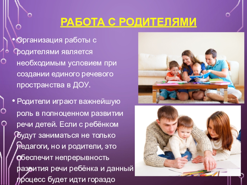 Родители играют важнейшую роль в полноценном развитии речи детей. Если с ребёнком будут заниматься не только педагоги, но и родители, это обеспечит непрерывность развития речи ребёнка и данный процесс будет идти гораздо быстрее.