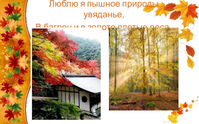 Слайд 4Люблю я пышное природы увяданье, В багрец и в золото одетые леса,