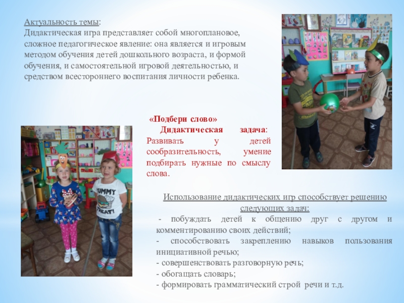 Дидактическая задача: Развивать у детей сообразительность, умение подбирать нужные по смыслу слова.
