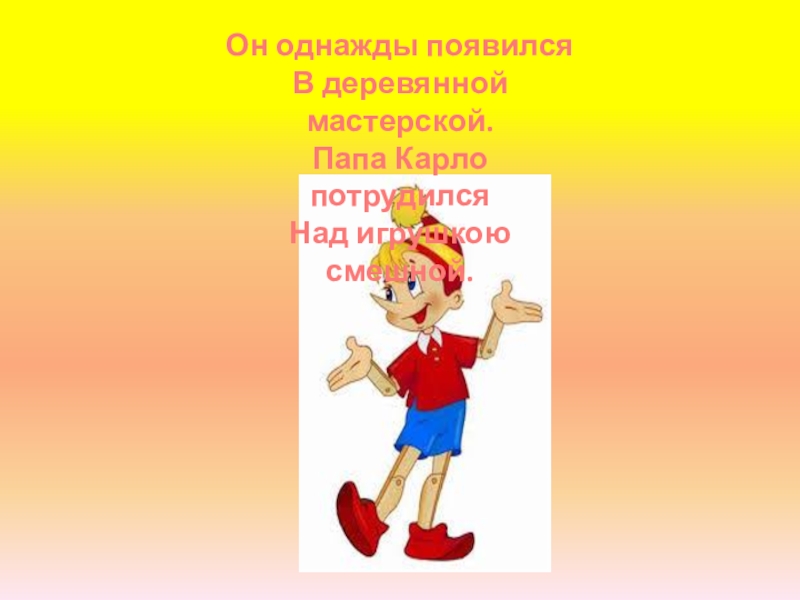 Он однажды появилсяВ деревянной мастерской.Папа Карло потрудилсяНад игрушкою смешной.