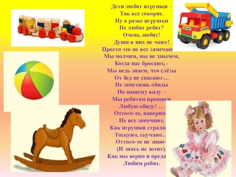Дети любят игрушки – Так все говорят.Ну а разве игрушкиНе любят ребят?Очень любят!Души в них не чают!Просто