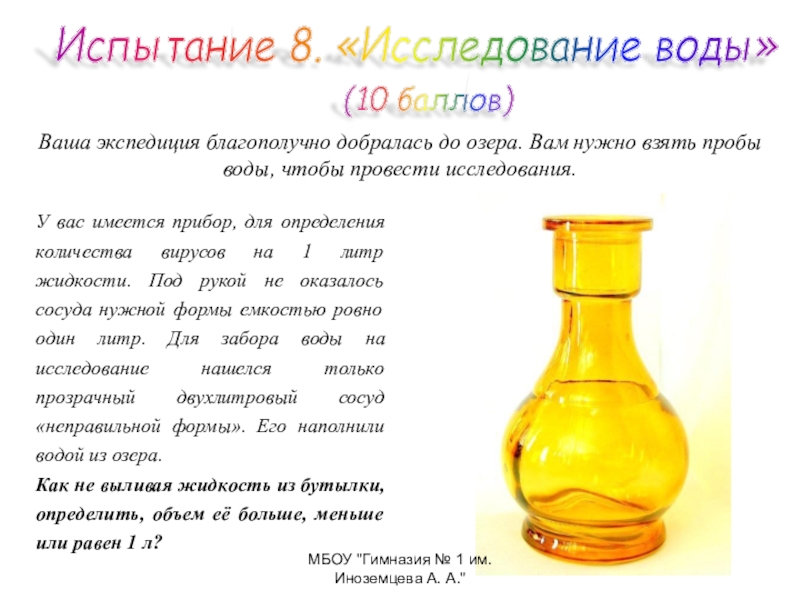 У вас имеется прибор, для определения количества вирусов на 1 литр жидкости. Под рукой не оказалось сосуда нужной формы емкостью ровно один литр. Для забора воды на исследование нашелся только прозрачный двухлитровый сосуд «неправильной формы». Его наполнили водой из озера.