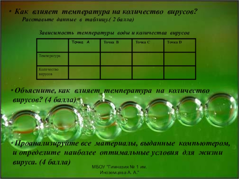 Проанализируйте все материалы, выданные компьютером, и определите наиболее оптимальные условия для жизни вируса. (4 балла)