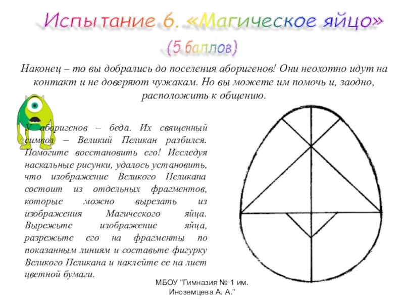 У аборигенов – беда. Их священный символ – Великий Пеликан разбился. Помогите восстановить его! Исследуя наскальные рисунки, удалось установить, что изображение Великого Пеликана состоит из отдельных фрагментов, которые можно вырезать из изображения Магического яйца. Вырежьте изображение яйца, разрежьте его на фрагменты по показанным линиям и составьте фигурку Великого Пеликана и наклейте ее на лист цветной бумаги.