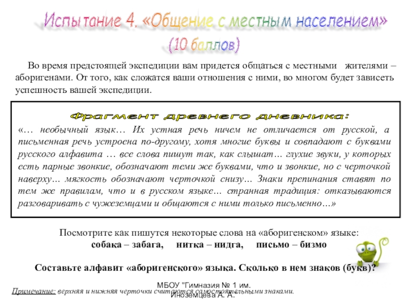 «… необычный язык… Их устная речь ничем не отличается от русской, а письменная речь устроена по-другому, хотя многие буквы и совпадают с буквами русского алфавита … все слова пишут так, как слышат… глухие звуки, у которых есть парные звонкие, обозначают теми же буквами, что и звонкие, но с черточкой наверху… мягкость обозначают черточкой снизу… Знаки препинания ставят по тем же правилам, что и в русском языке… странная традиция: отказываются разговаривать с чужеземцами и общаются с ними только письменно…»