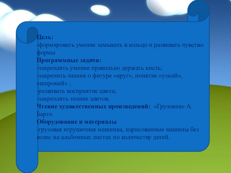 Цель: -формировать умение замыкать в кольцо и развивать чувство формыПрограммные задачи:-закреплять умение правильно держать кисть;-закрепить знания о фигуре «круг», понятие «узкий», «широкий» ;-развивать восприятие цвета;-закреплять знание цветов.Чтение художественных произведений: «Грузовик» А.Барто.Оборудование и материалы -грузовая игрушечная машинка,