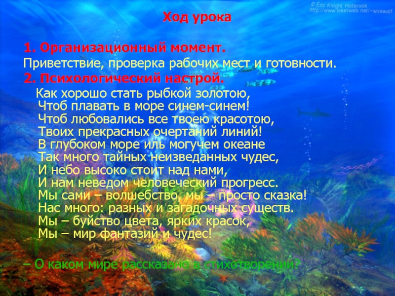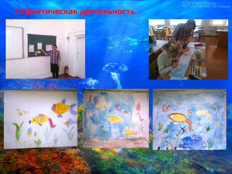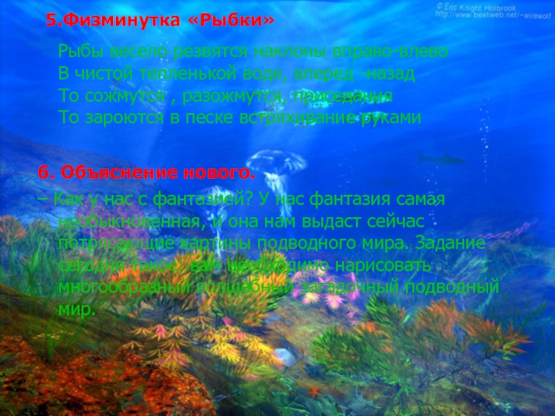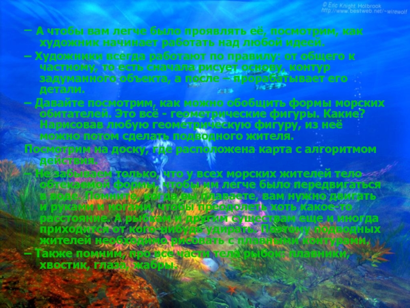 – Как у нас с фантазией? У нас фантазия самая необыкновенная, и она нам выдаст сейчас потрясающие картины подводного мира. Задание сегодня такое: вам необходимо нарисовать многообразный волшебный загадочный подводный мир.