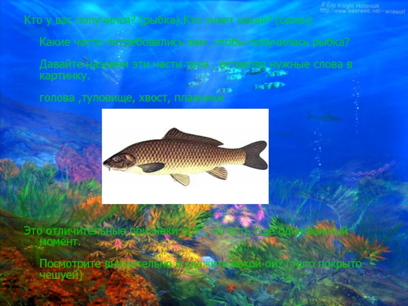 Слайд 5Кто у вас получился? (рыбка).Кто знает какая? (сазан)
