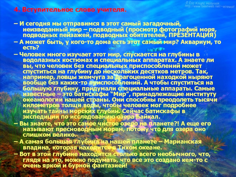 – Человек много изучает этот мир, спускается на глубины в водолазных костюмах и специальных аппаратах. А знаете ли вы, что человек без специальных приспособлений может спуститься на глубину до нескольких десятков метров. Так, например, ловцы жемчуга за драгоценной находкой ныряют вообще без каких-то приспособлений. А чтобы спуститься на большую глубину, придумали специальные аппараты. Самые известные – это батискафы “Мир”, принадлежащие институту океанологии нашей страны. Они способны преодолеть тысячи километров толщи воды, чтобы человек мог подробнее изучать тайны морских глубин. Сейчас батискафы в экспедиции по исследованию озера Байкал.