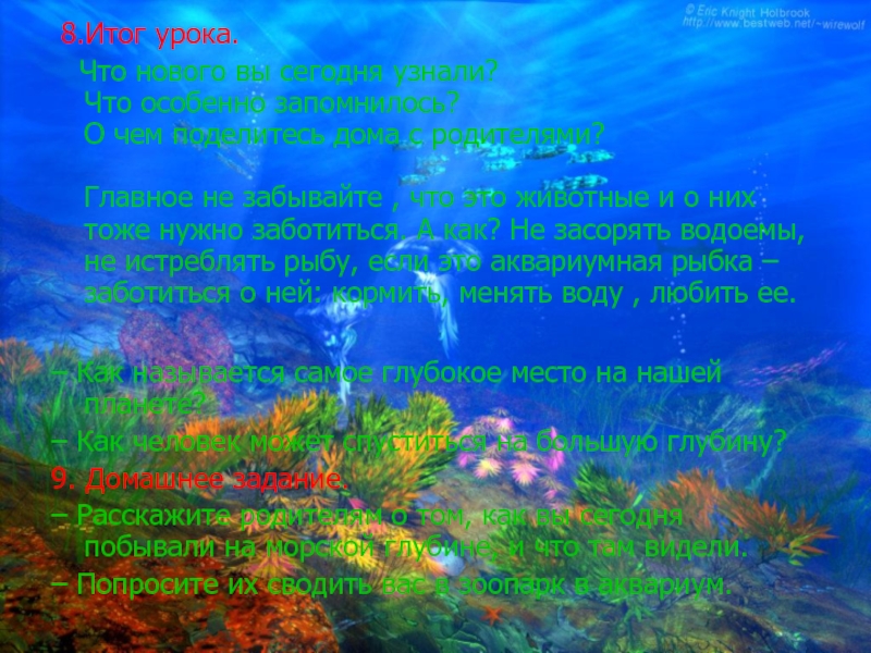 – Расскажите родителям о том, как вы сегодня побывали на морской глубине, и что там видели.