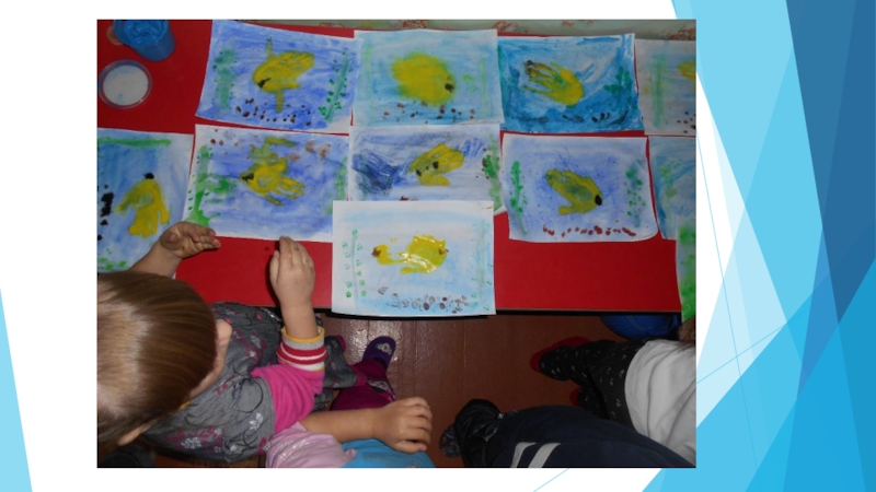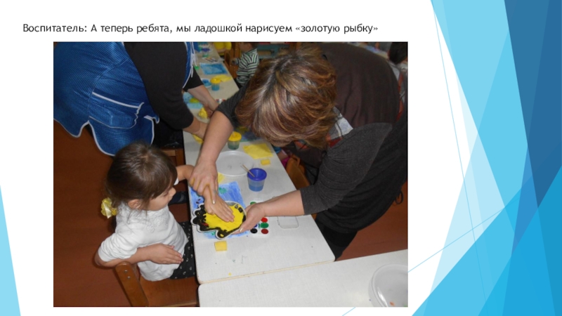 Слайд 18Воспитатель: А теперь ребята, мы ладошкой нарисуем «золотую рыбку»
