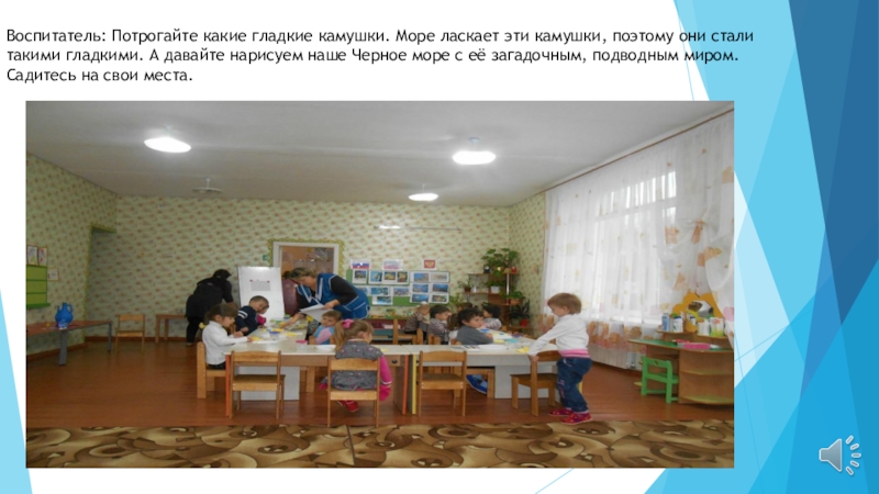 Слайд 6Воспитатель: Потрогайте какие гладкие камушки. Море ласкает эти камушки, поэтому они