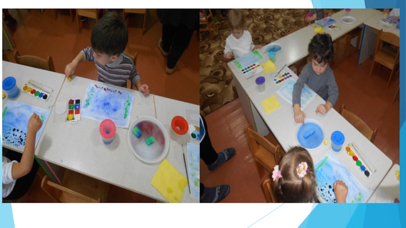 Воспитатель: Посмотрите как я буду рисовать море. Губкой смачиваю лист быстрыми движениями,
