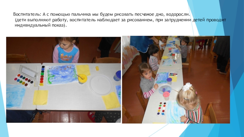 Слайд 15Воспитатель: А с помощью пальчика мы будем рисовать песчаное дно, водоросли.