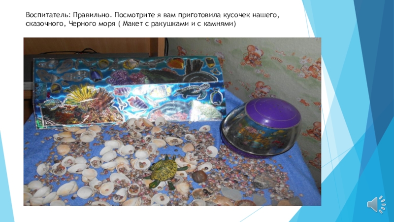 Слайд 5Воспитатель: Правильно. Посмотрите я вам приготовила кусочек нашего, сказочного, Черного моря