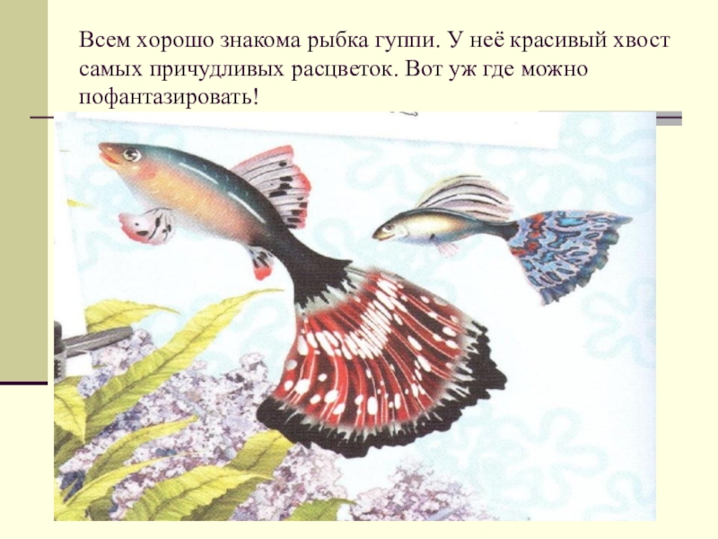 Слайд 3Всем хорошо знакома рыбка гуппи. У неё красивый хвост самых причудливых