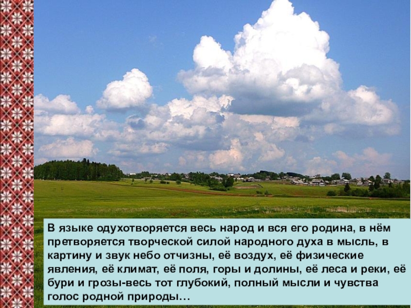 В языке одухотворяется весь народ и вся его родина, в нём претворяется творческой силой народного духа в мысль, в картину и звук небо отчизны, её воздух, её физические явления, её климат, её поля, горы и долины, её леса и реки, её бури и грозы-весь тот глубокий, полный мысли и чувства голос родной природы…