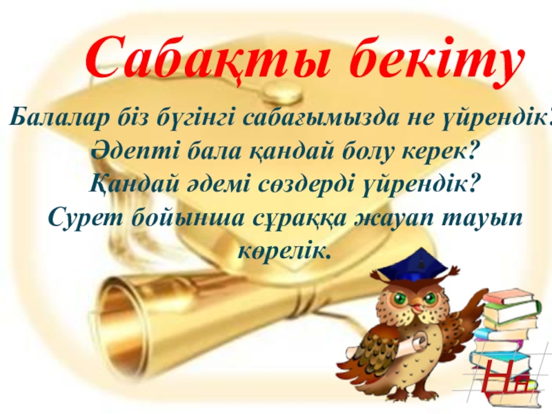 Сабақты бекітуБалалар біз бүгінгі сабағымызда не үйрендік? Әдепті бала қандай болу керек? Қандай әдемі сөздерді үйрендік? Сурет