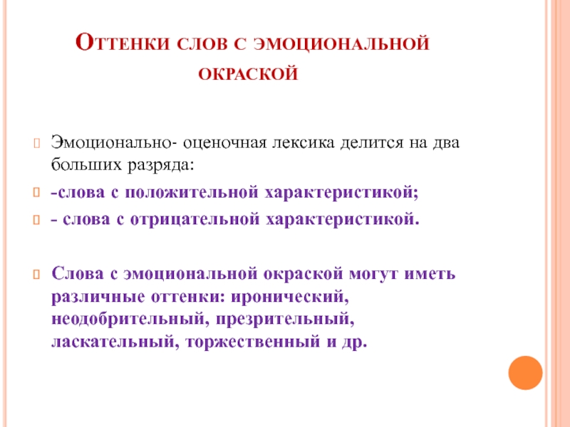 Слова с эмоциональной окраской могут иметь различные оттенки: иронический, неодобрительный, презрительный, ласкательный, торжественный и др.
