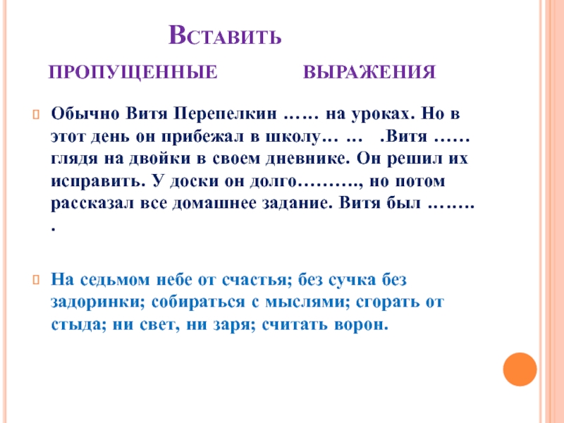 Обычно Витя Перепелкин …… на уроках. Но в этот день он прибежал в школу… … .Витя …… глядя на двойки в своем дневнике. Он решил их исправить. У доски он долго………., но потом рассказал все домашнее задание. Витя был …….. .