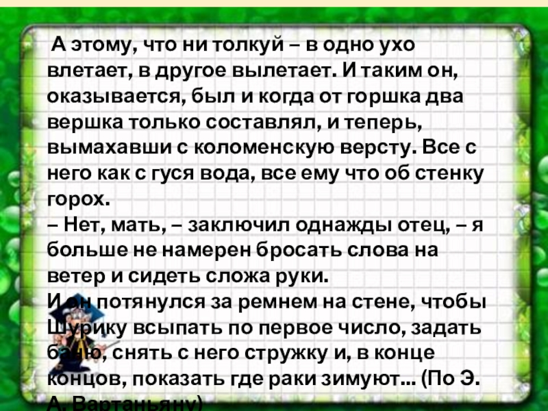 Слайд 10 А этому, что ни толкуй – в одно ухо влетает,