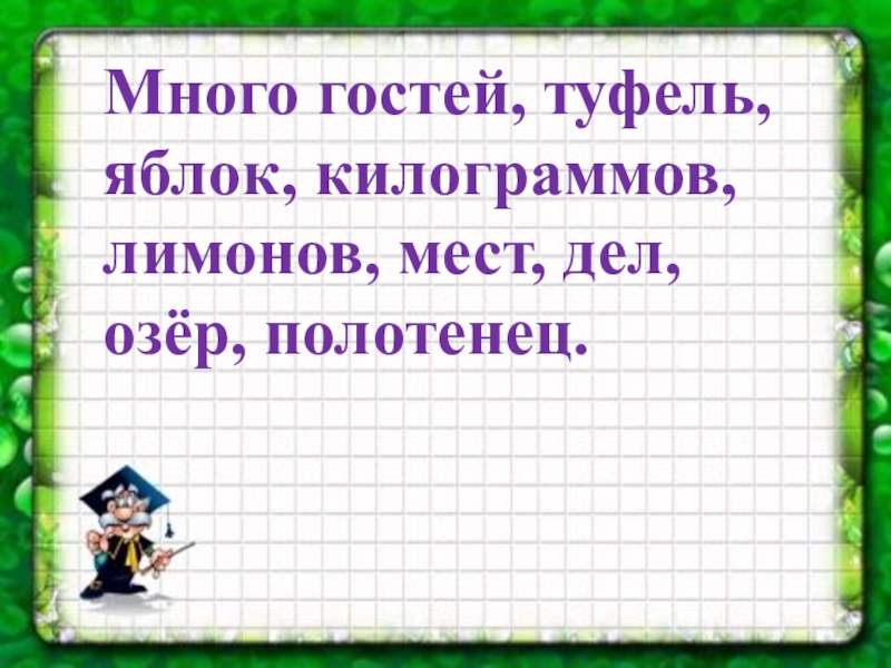 Слайд 8Много гостей, туфель, яблок, килограммов, лимонов, мест, дел, озёр, полотенец.
