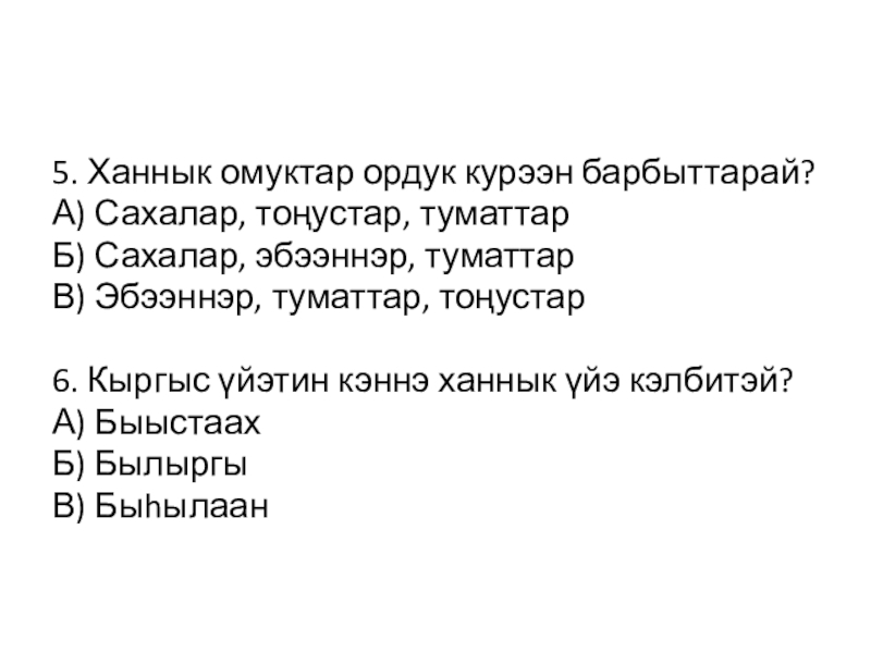 5. Ханнык омуктар ордук курээн барбыттарай?А) Сахалар, тоңустар, туматтарБ) Сахалар, эбээннэр, туматтарВ) Эбээннэр, туматтар, тоңустар6. Кыргыс үйэтин
