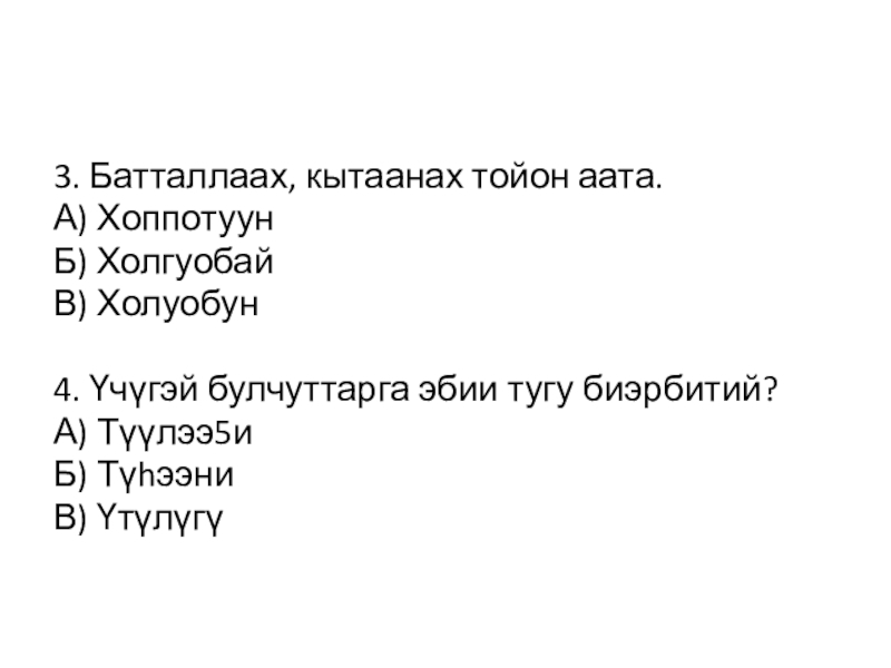 3. Батталлаах, кытаанах тойон аата.А) ХоппотуунБ) ХолгуобайВ) Холуобун4. Үчүгэй булчуттарга эбии тугу биэрбитий?А) Түүлээ5иБ) ТүhээниВ) Үтүлүгү