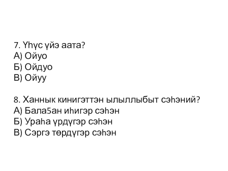7. Үһүс үйэ аата?А) ОйуоБ) ОйдуоВ) Ойуу8. Ханнык кинигэттэн ылыллыбыт сэhэний?А) Бала5ан иhигэр сэhэнБ) Ураhа үрдүгэр сэhэнВ)