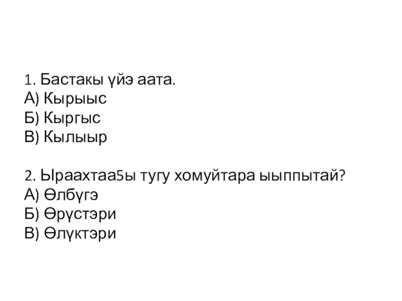 1. Бастакы үйэ аата.А) КырыысБ) КыргысВ) Кылыыр2. Ыраахтаа5ы тугу хомуйтара ыыппытай?А) ӨлбүгэБ) ӨрүстэриВ) Өлүктэри