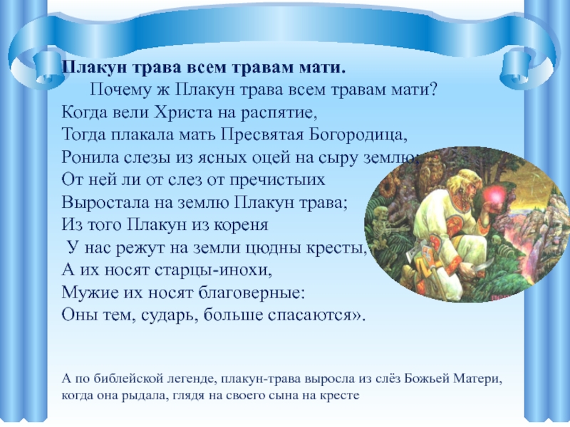 А по библейской легенде, плакун-трава выросла из слёз Божьей Матери, когда она рыдала, глядя на своего сына на кресте
