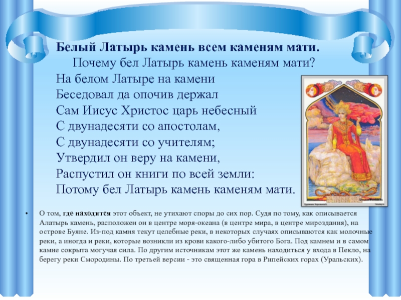 по тому, как описывается Алатырь камень, расположен он в центре моря-океана (в центре мира, в центре мироздания), на острове Буяне. Из-под камня текут целебные реки, в некоторых случаях описываются как молочные реки, а иногда и реки, которые возникли из крови какого-либо убитого Бога. Под камнем и в самом камне сокрыта могучая сила. По другим источникам этот же камень находиться у входа в Пекло, на берегу реки Смородины. По третьей версии - это священная гора в Рипейских горах (Уральских).
