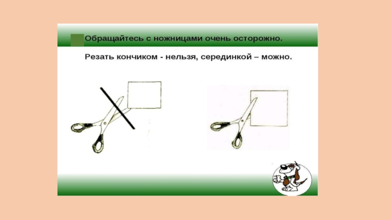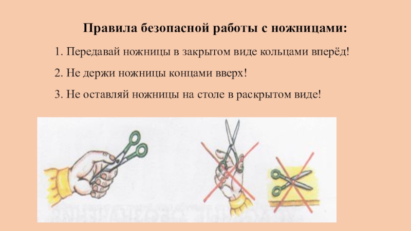 Правила безопасной работы с ножницами:  1. Передавай ножницы в закрытом виде кольцами вперёд! 2. Не держи