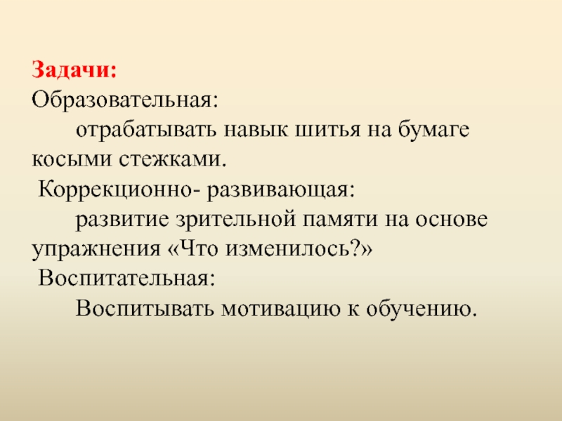 Задачи: Образовательная:    отрабатывать навык шитья на бумаге косыми стежками. Коррекционно- развивающая: