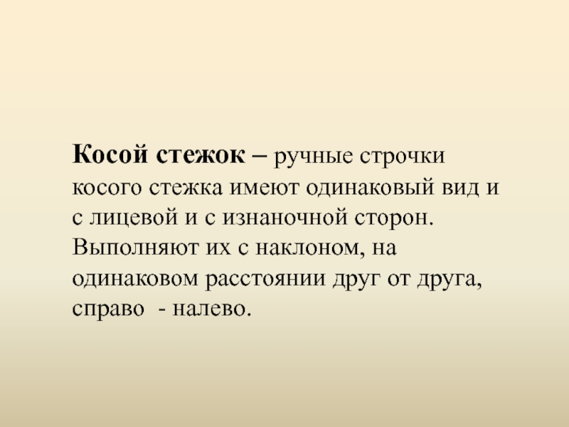 Слайд 8Косой стежок – ручные строчки косого стежка имеют одинаковый вид и
