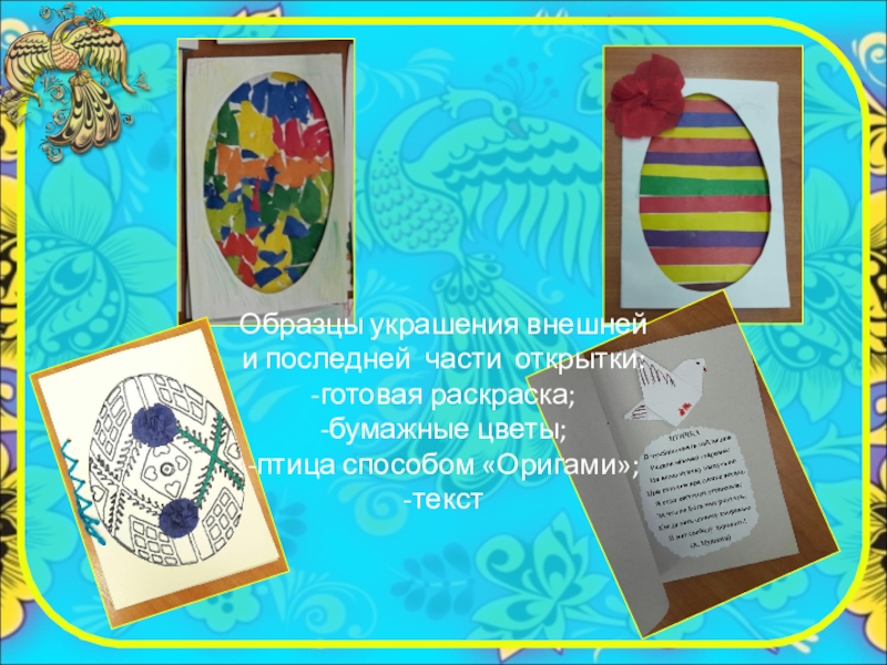 Образцы украшения внешней и последней части открытки:-готовая раскраска;-бумажные цветы;-птица способом «Оригами»;-текст