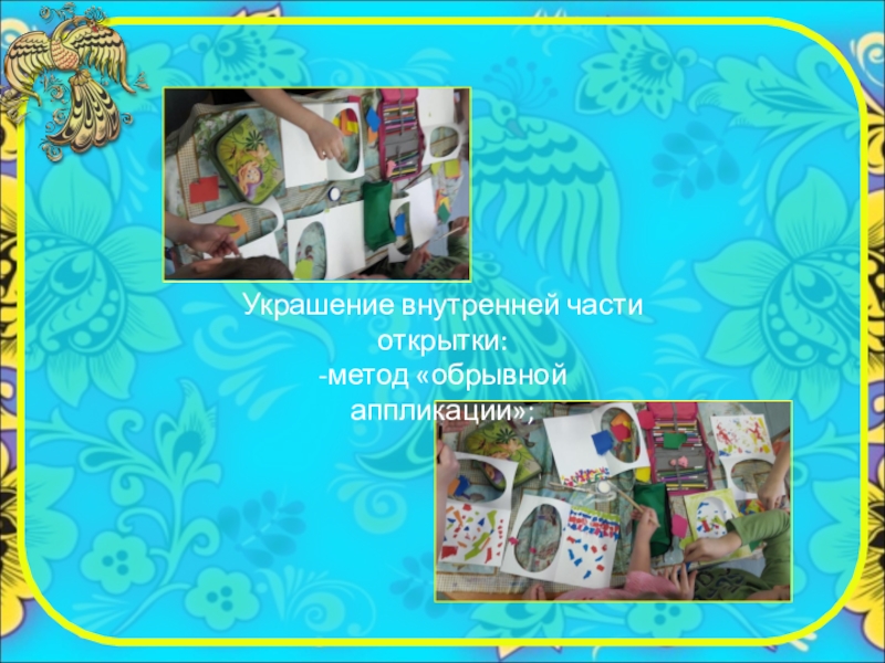 Украшение внутренней части открытки:-метод «обрывной аппликации»;