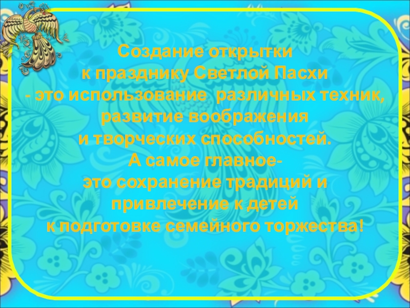 Создание открытки к празднику Светлой Пасхи - это использование различных техник,развитие воображения и творческих способностей.А самое главное-это сохранение традиций и привлечение к детей к подготовке семейного торжества!