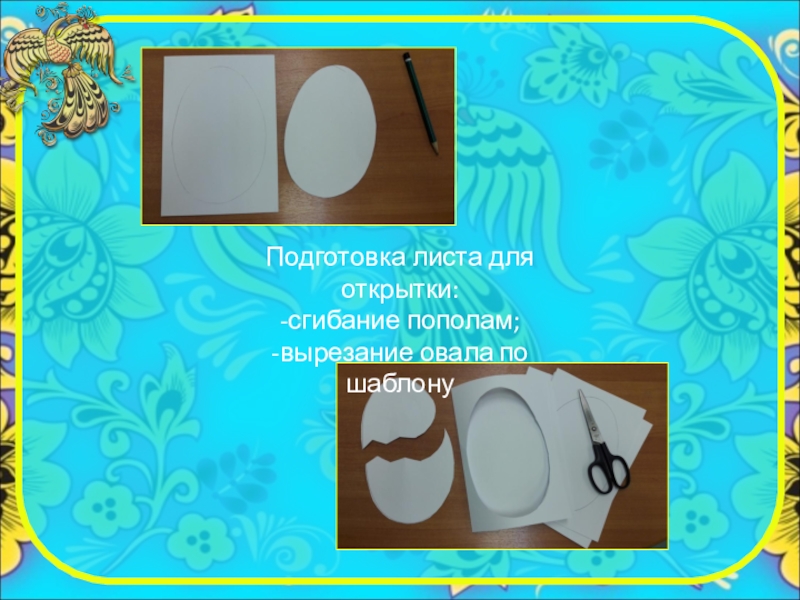 Подготовка листа для открытки:-сгибание пополам;-вырезание овала по шаблону