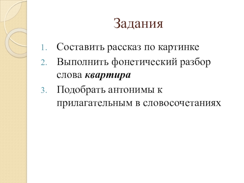 Задания Составить рассказ по картинке Выполнить фонетический разбор слова квартираПодобрать антонимы к прилагательным в словосочетаниях